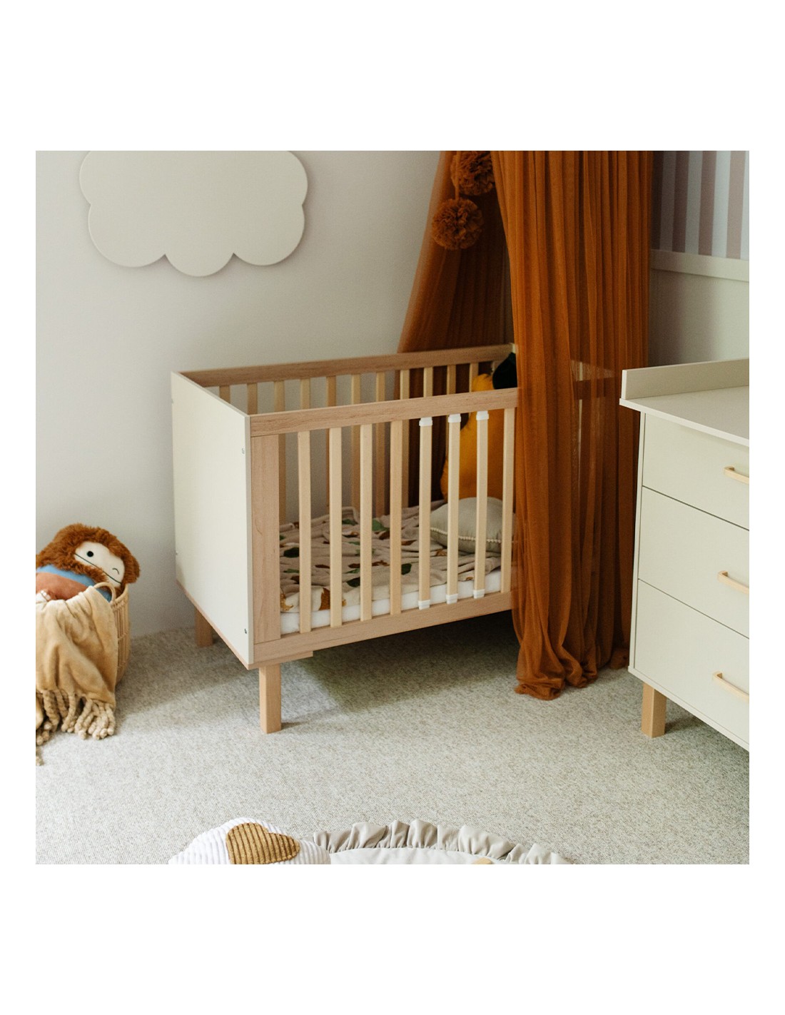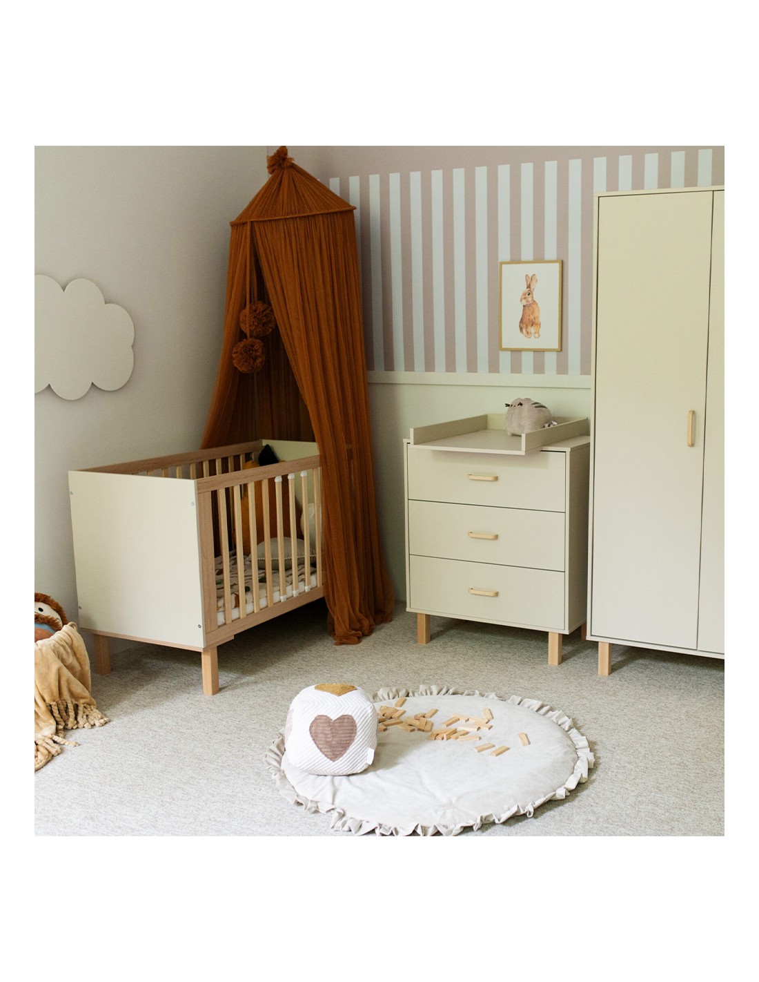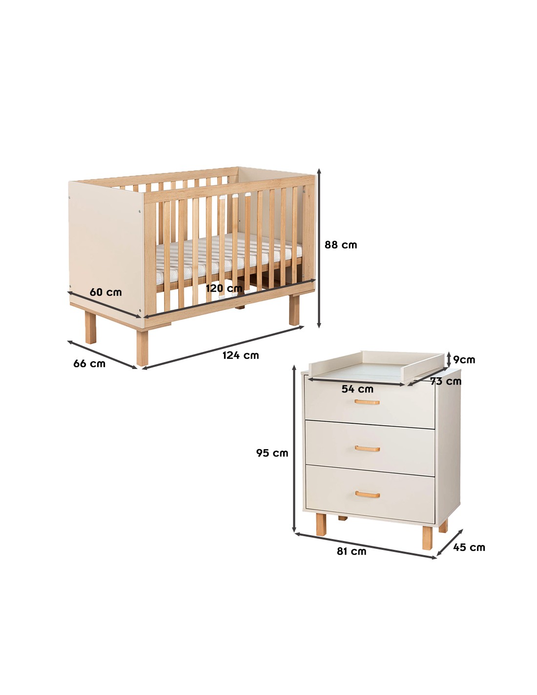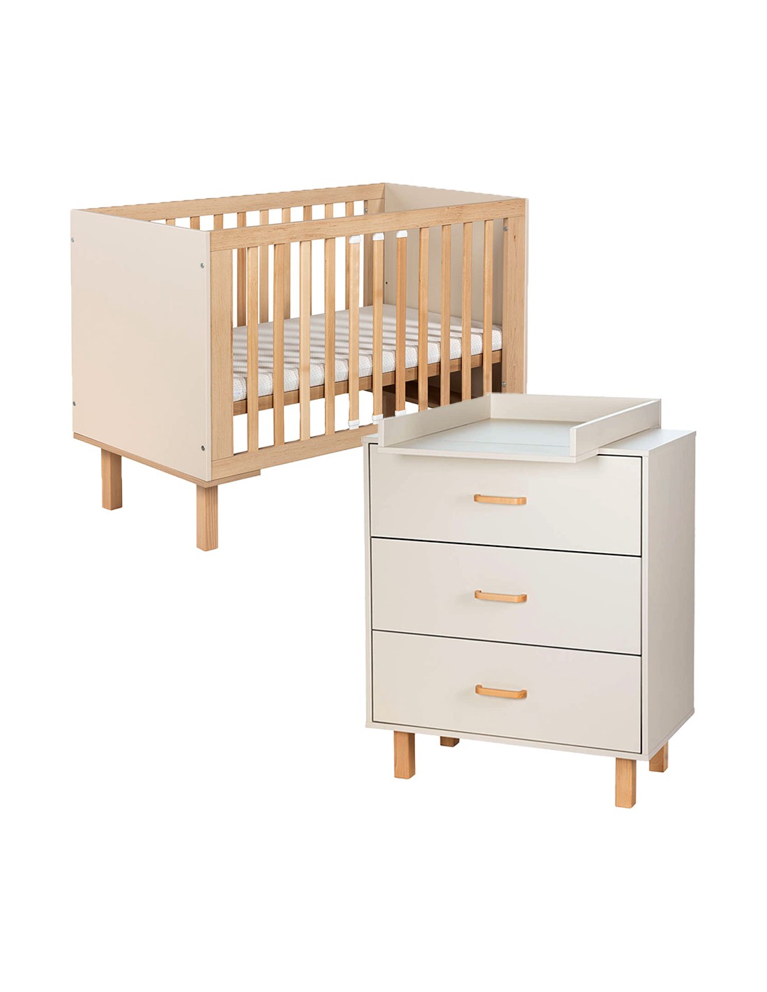 Cet ensemble est composé d’un lit à barreaux et d’une commode. Un plan à langer amovible pour le lit ou la commode est disponible, au choix. Pour le confort de bébé, il est préférable d'installer un matelas à langer sur le plateau (matelas à langer non inclus).