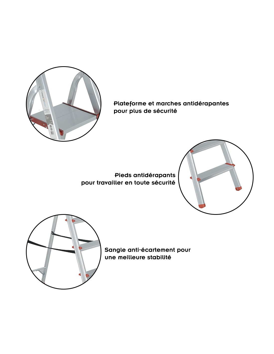 Conforme aux normes EN-131-1, EN-131-2 et EN-131-3. Poids maximum supporté : 150 kg.