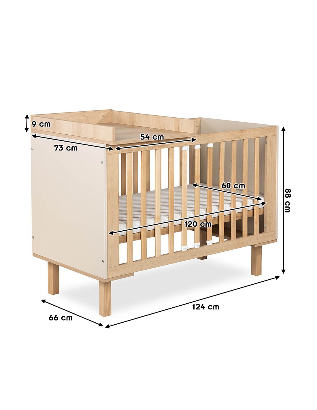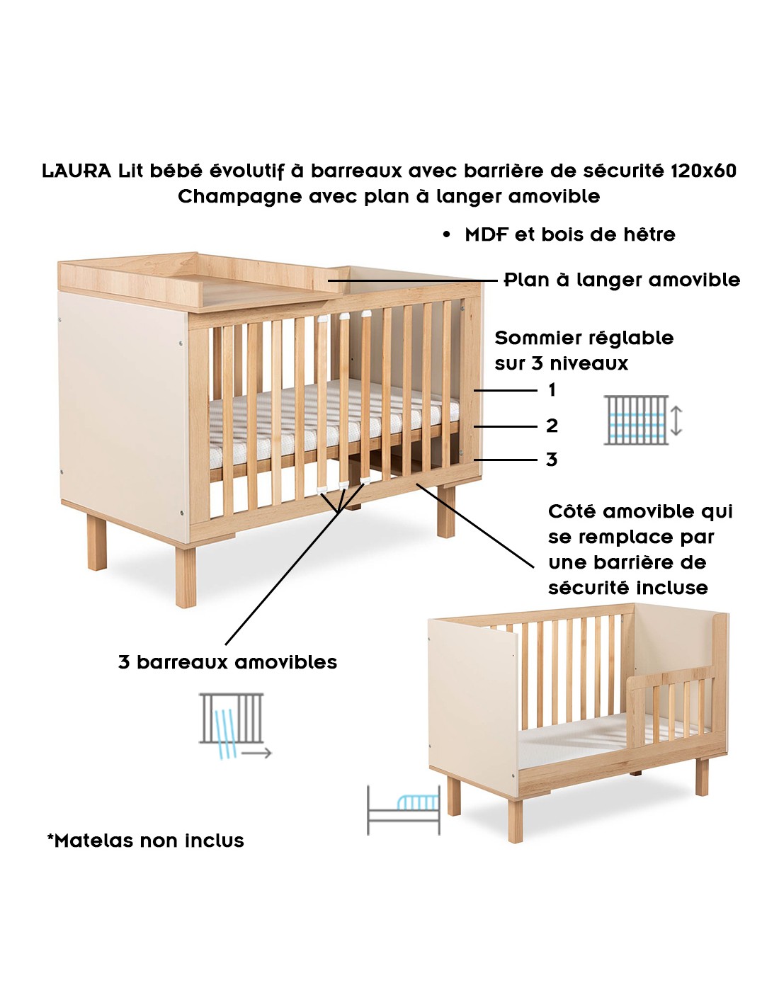 AMELIA II Lit bébé évolutif avec barrière de sécurité