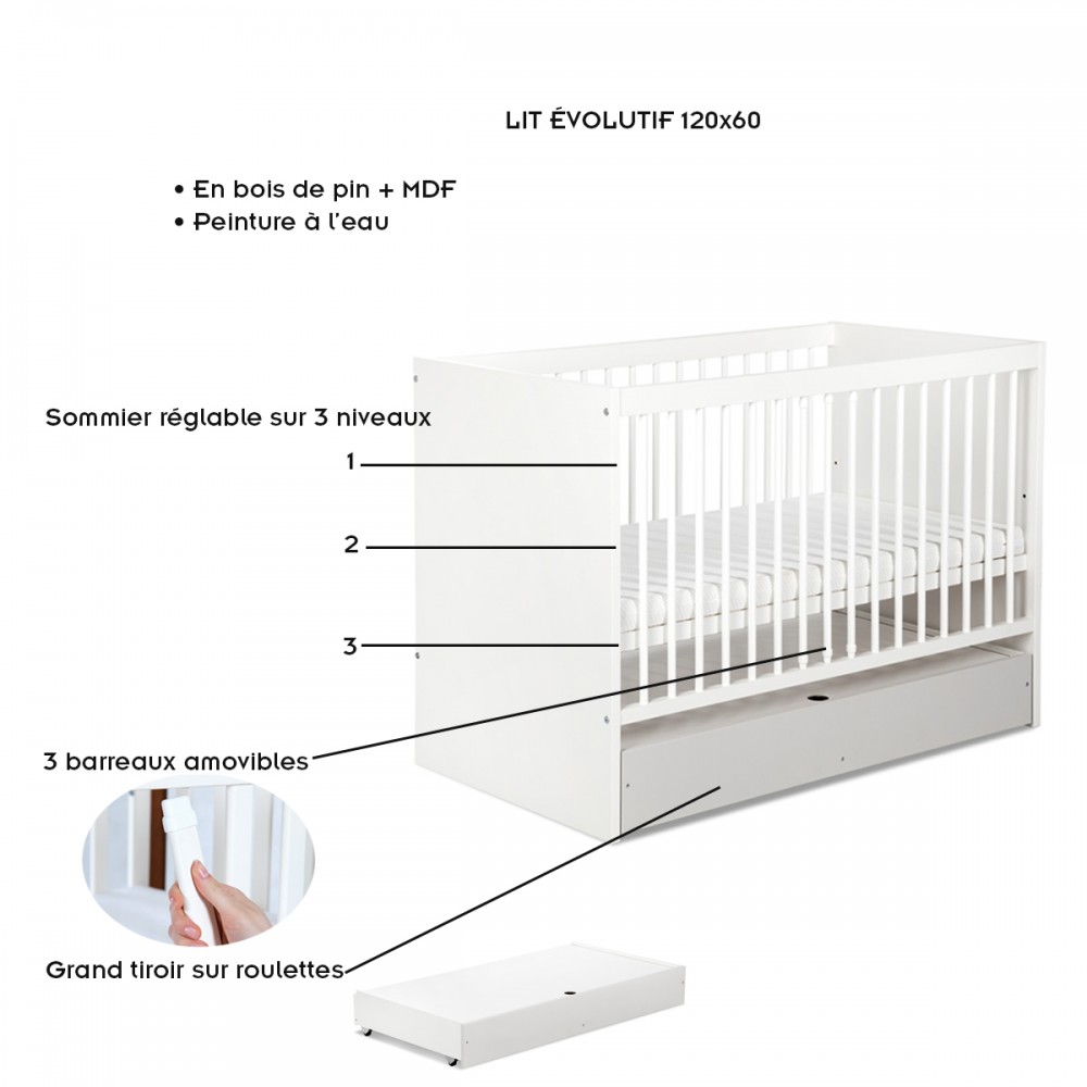 - Lit évolutif dont le sommier peut s'adapter sur 3 niveaux différents pour suivre l'évolution de l'enfant.