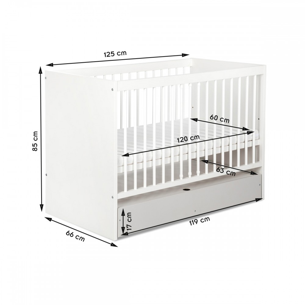 Dimensions extérieures du lit : L 125 cm x l 66 cm x H 85 cm.