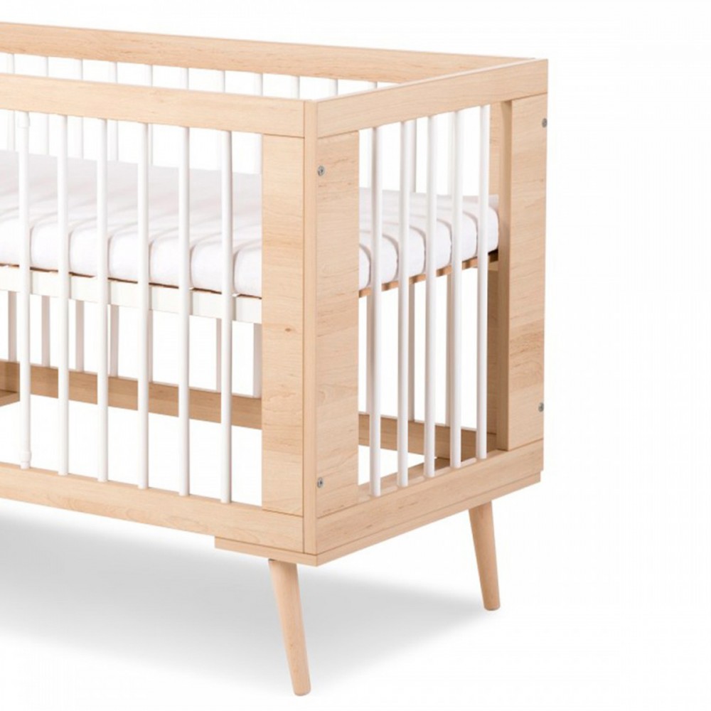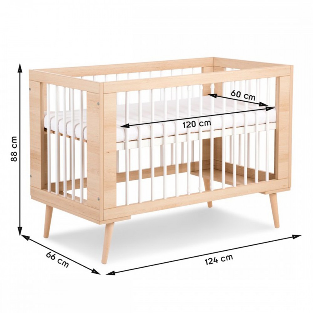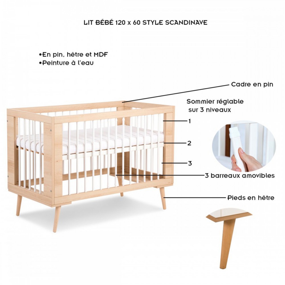 Lit 120x60 cm avec sommier à lattes réglable et barreaux amovibles. 2 modèles : blanc ou hêtre.