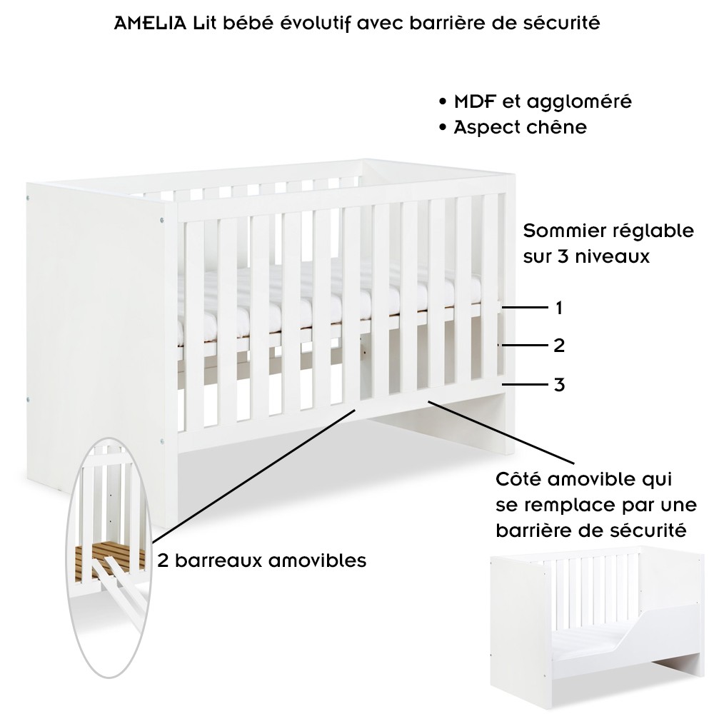 AMELIA Lit bébé évolutif avec barrière de sécurité