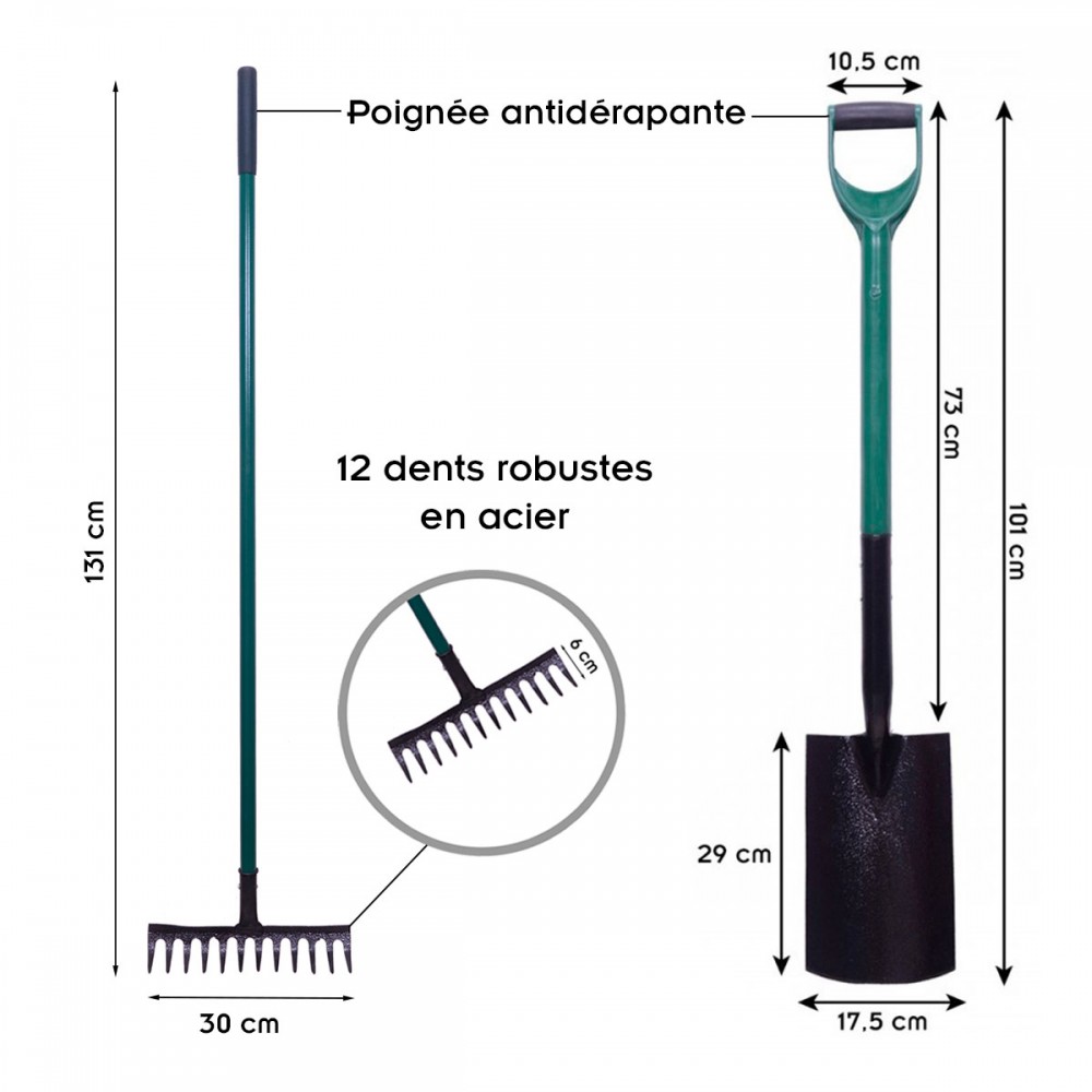 - Pelle, fourche, bêche, râteau, râteau à feuilles et griffe 3 dents.