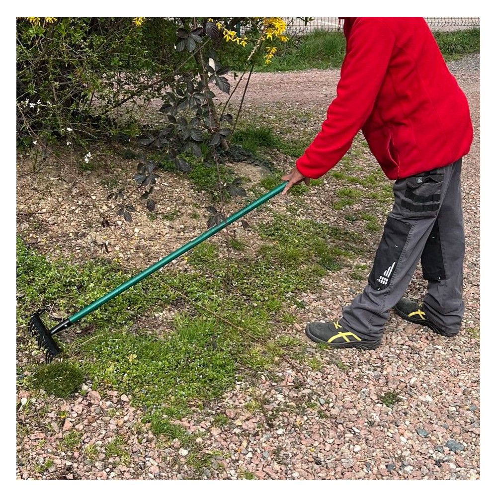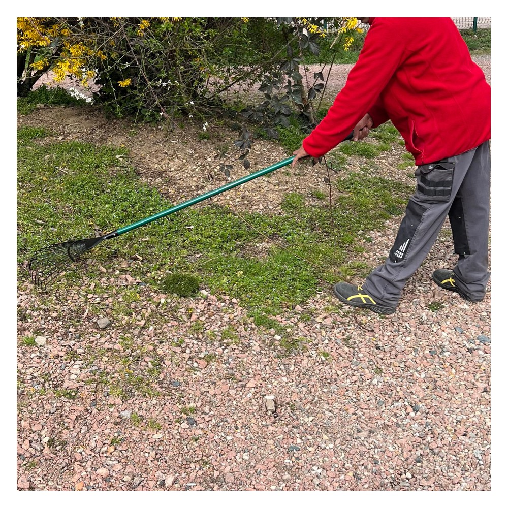 Cet outil est votre allié pour ramasser les feuilles grâce à ses 16 dents robustes espacées chacune d'environ 3 cm. Egalement appelé balai à gazon, il est idéal pour ramasser l'herbe après la tonte, ou scarifier le gazon. Son raidisseur central vous permet de ne pas abîmer votre pelouse : la pression envoyée est la même dans chaque dent. Son manche d'une grande taille vous assure un confort optimal. 1,25 kg.