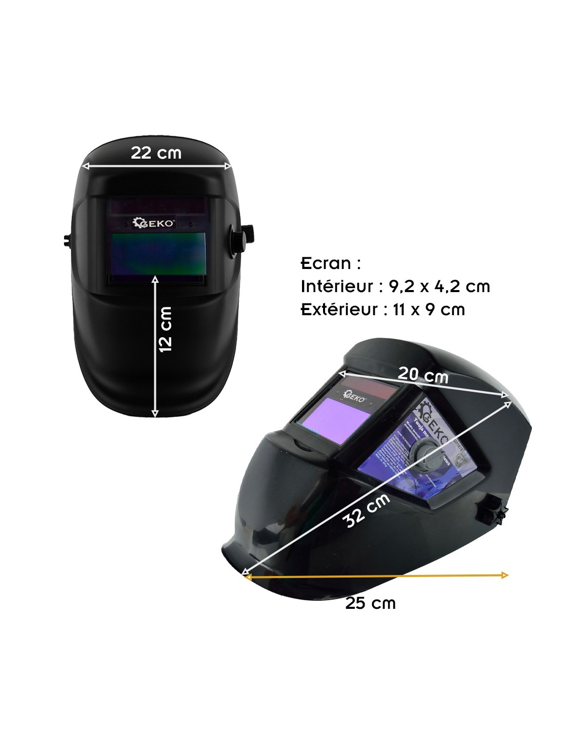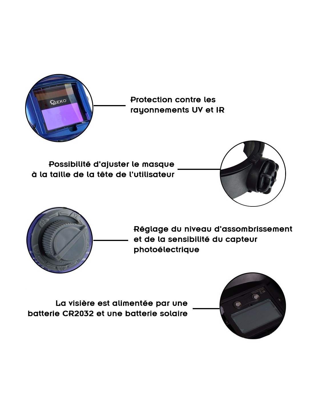Le masque de soudage à obscurcissement automatique est conçu pour protéger les yeux et le visage des étincelles, des projections et des rayonnements UV et IR nocifs pendant le soudage.