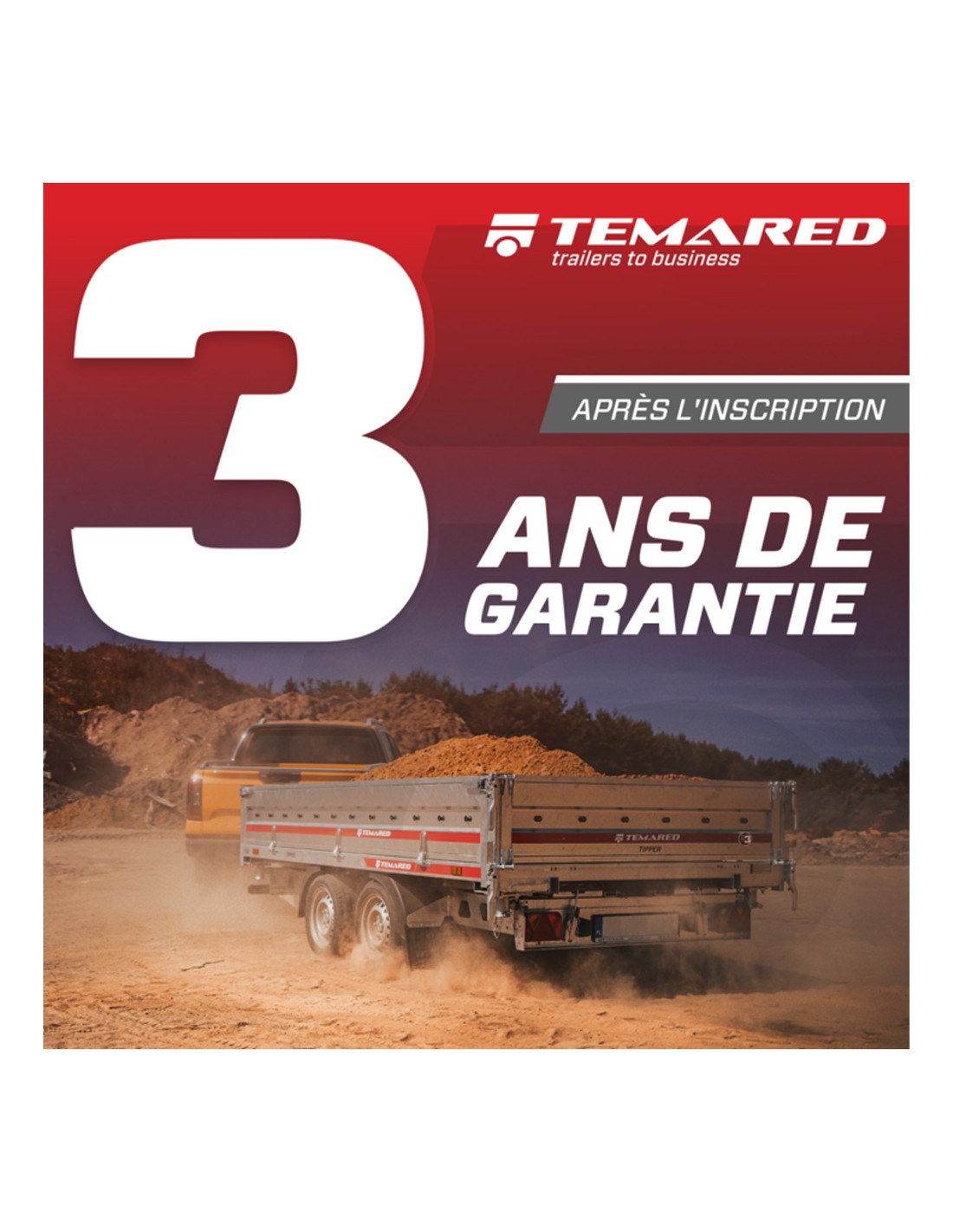 Remorque neuve livrée entièrement montée (sur plateau ou tractée) en France continentale uniquement. Garantie 36 mois. Délai de livraison entre 2 et 5 semaines.