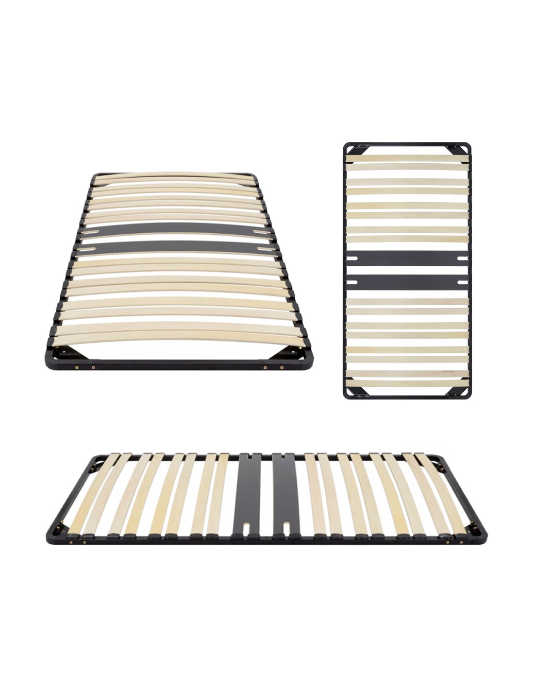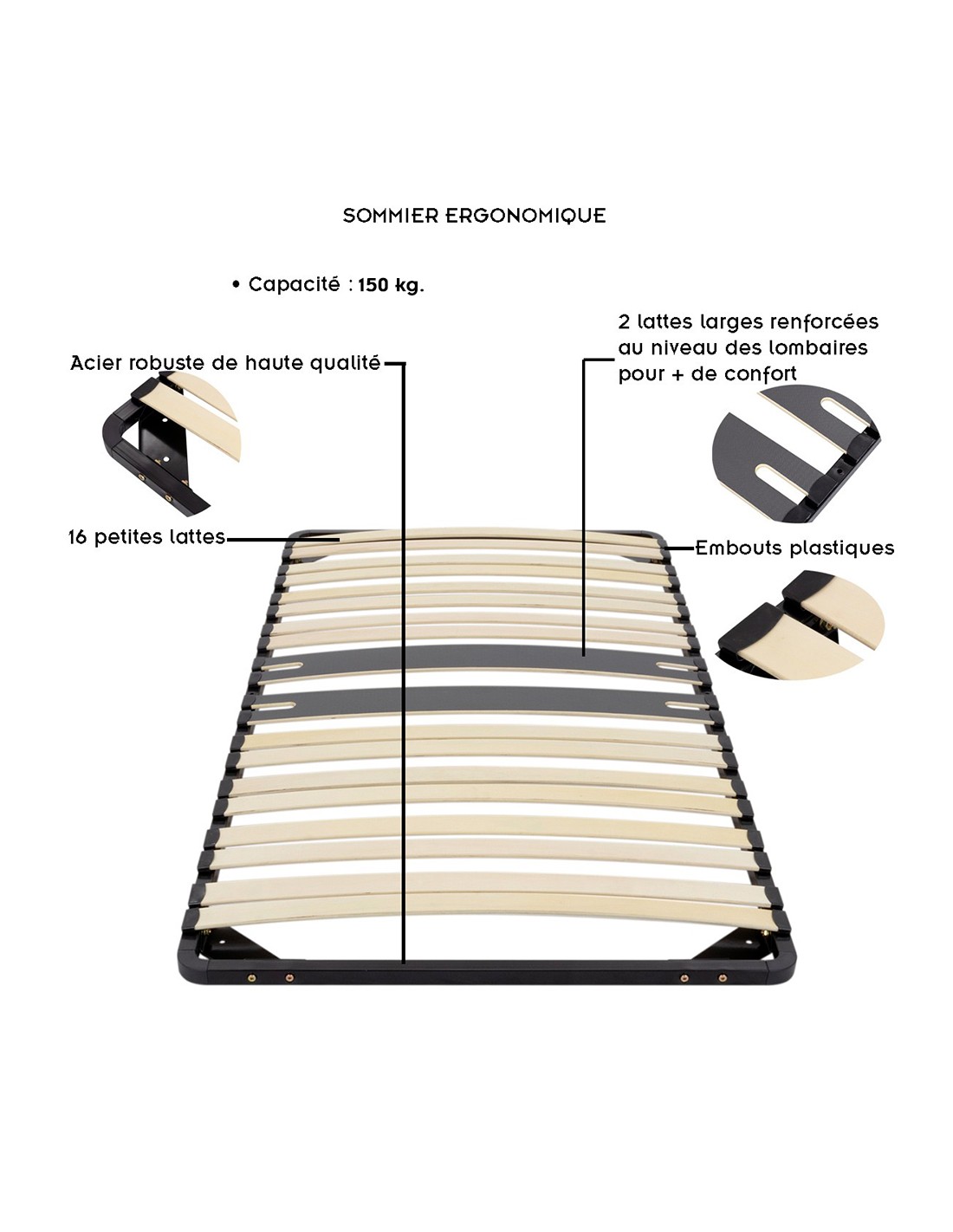 - Sommier ergonomique pour lit à lattes en bois. Renfort central avec 2 lattes assouplies au niveau du dos.